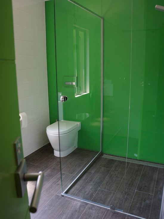 Baksida målad glasvägg i badrum